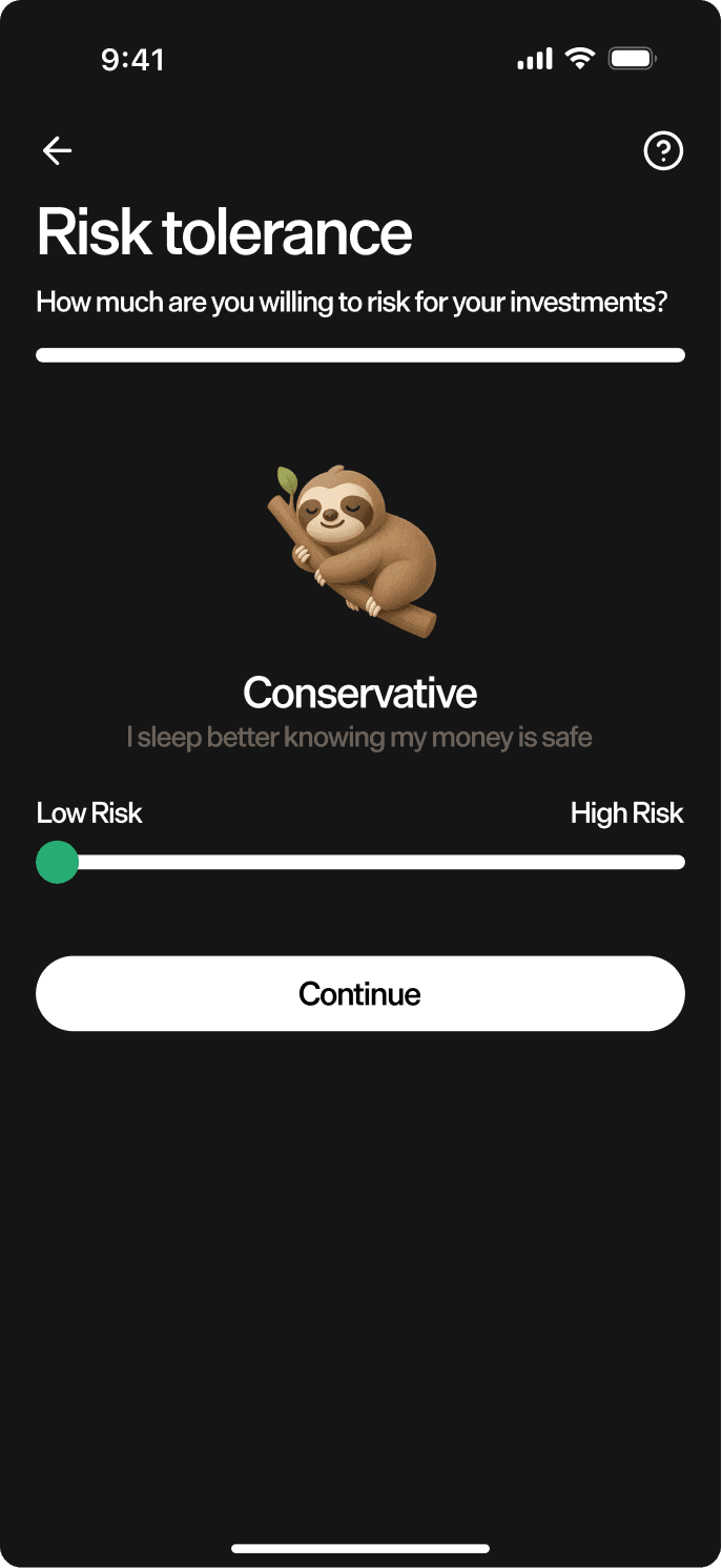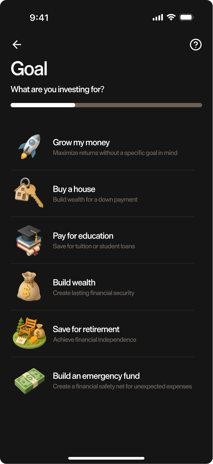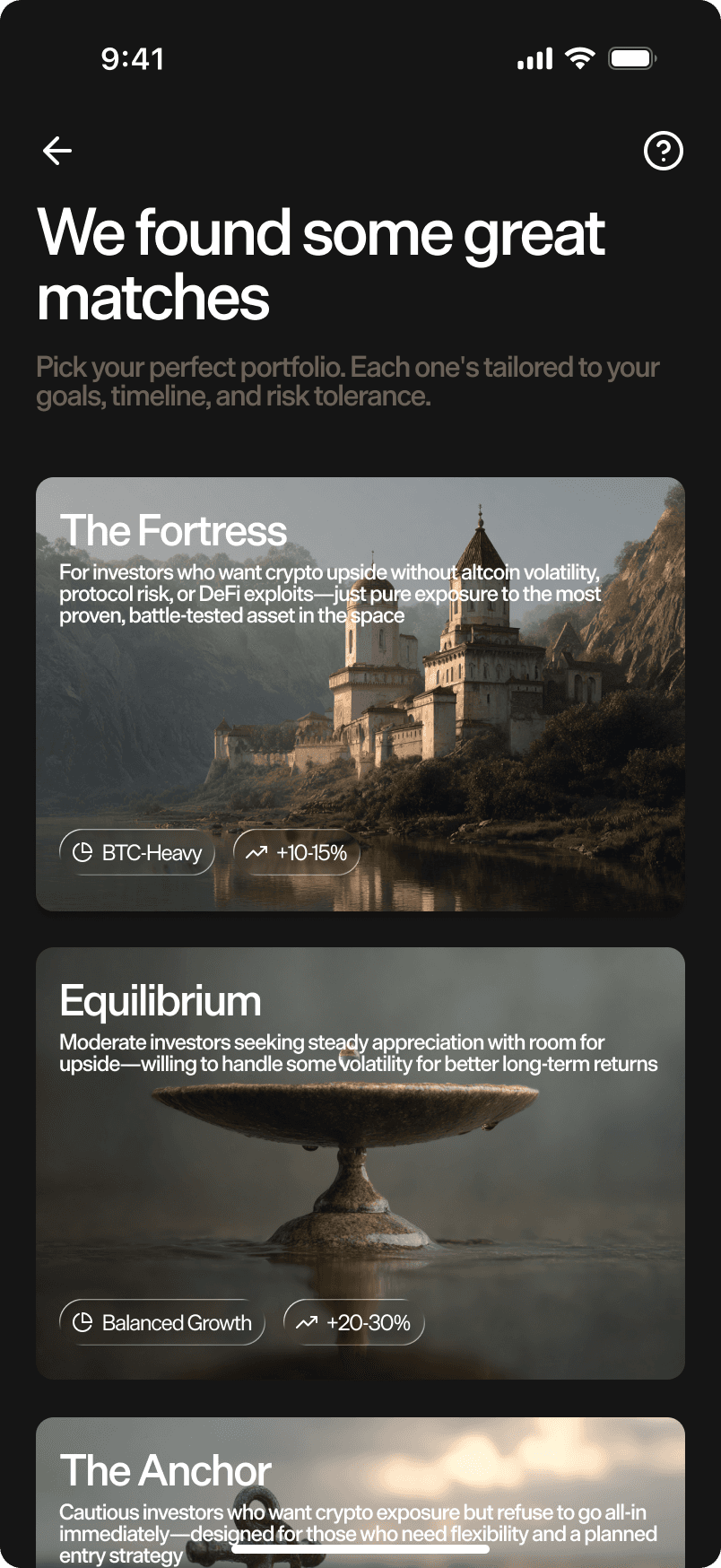 Users answer questions about goals, timeline, and risk tolerance to receive curated portfolio strategies with allocation breakdowns.