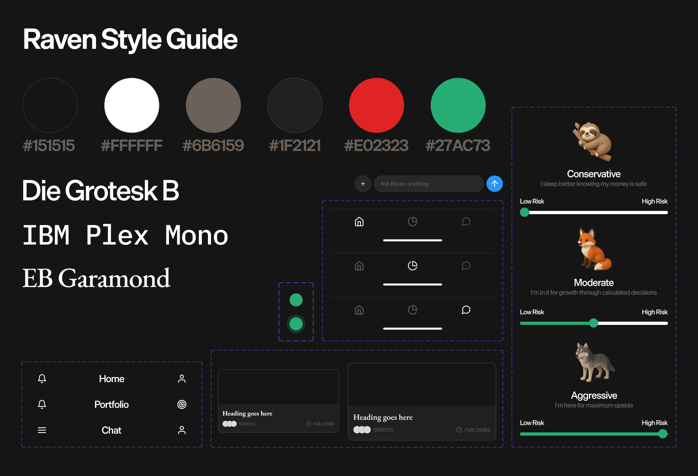 Cohesive visual system for Raven featuring typography, colors, and core components.