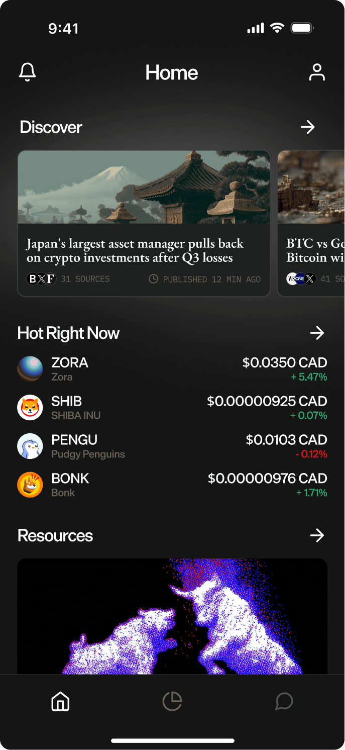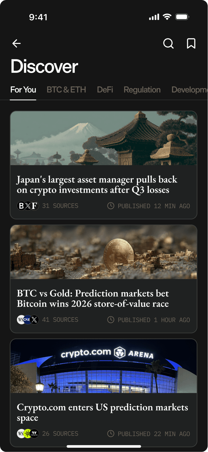 Users browse crypto news organized by topic and read AI-generated summaries with key takeaways and portfolio relevance.